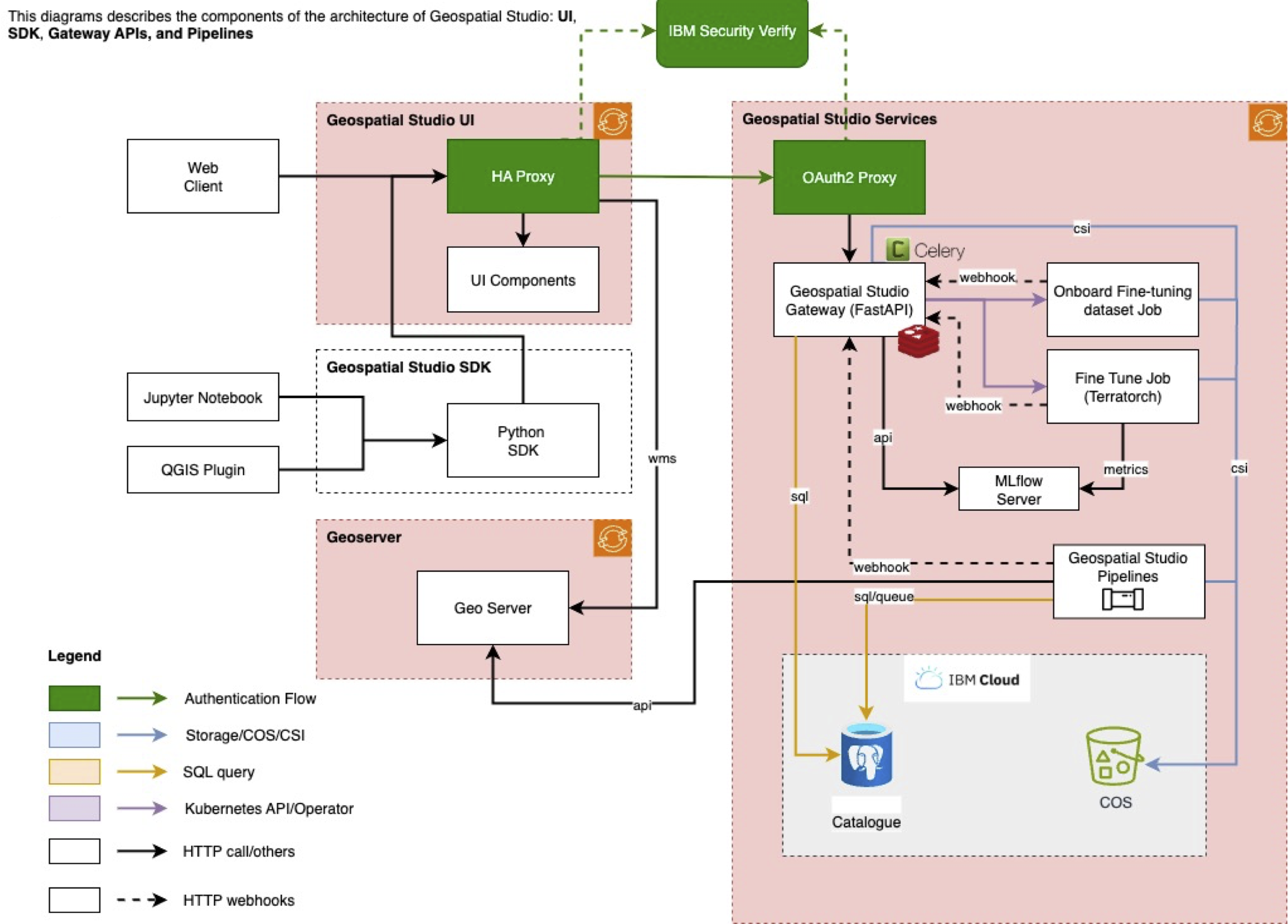 The IBM Geospatial Exploration and Orchestration Studio is a platform formed of an core backend API and services, pipelines, UIs and catalogues deployed on top of Red Hat OpenShift or Kubernetes.