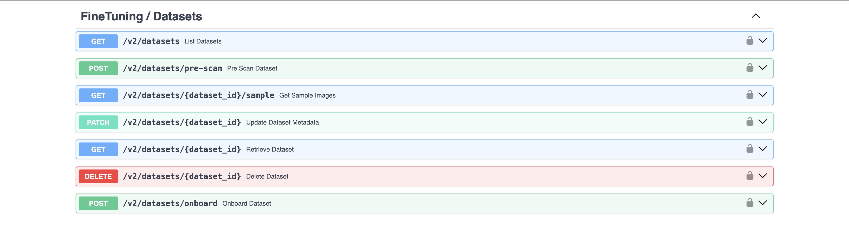 The Dataset Factory allows users to bring their curated geospatial datasets to the Studio to fine-tune their models. The dataset-factory endpoints allow users to onboard and delete datasets. In addition, some endpoints allow users to view their datasets' metadata. The front-end also uses the dataset-factory API to provide users with a preview of their datasets.