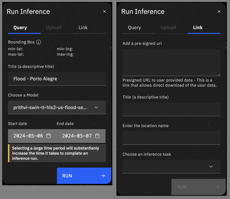Titlefor your inference run (so you can identify it in the list later) and you will need to select themodel. In this walkthrough we will use theprithvi-swin-tt-hls2-us-flood-segmentationmodel. Then etither: -