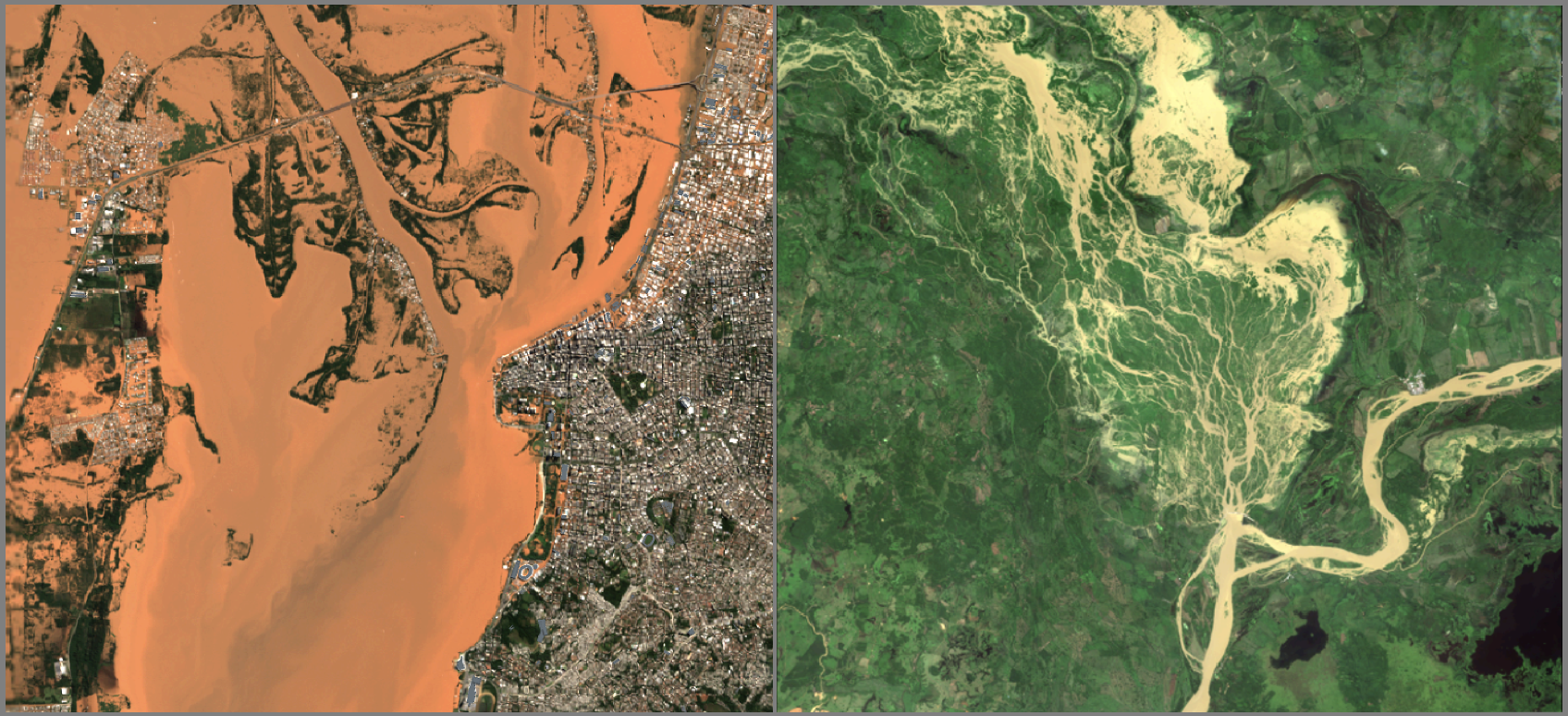 Flooding examples: Porto Alegre (Brazil) and Caro e Gato dike failure (Colombia), details below.