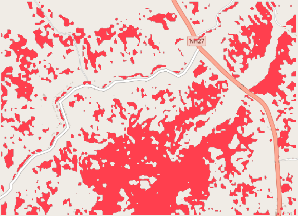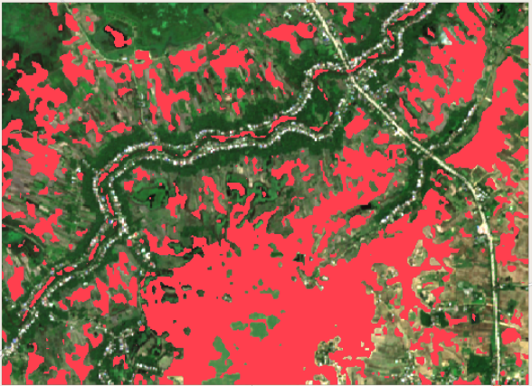 - Red areas indicate detected floods